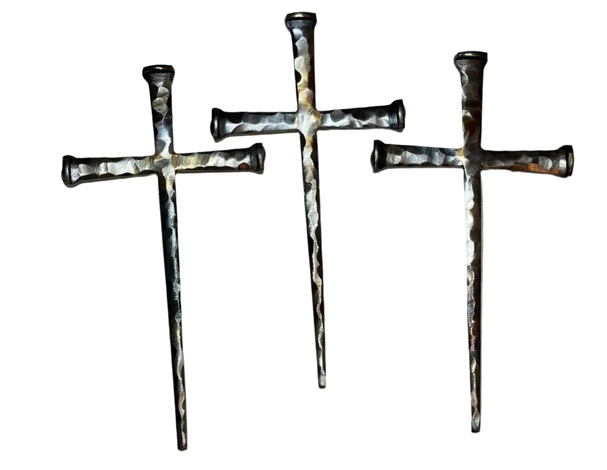 Introducing our striking handmade metal art piece featuring a hammered nail cross, a powerful tribute to the three crosses at Calvary. This unique design embodies faith and sacrifice, beautifully crafted to evoke a sense of reflection and reverence. The textured surface catches the light, adding a dynamic quality that draws the eye. Perfect for your home, church, or as a meaningful gift, this piece serves as a daily reminder of love, hope, and the profound significance of the cross. Embrace the spirit of faith with this inspiring artwork!